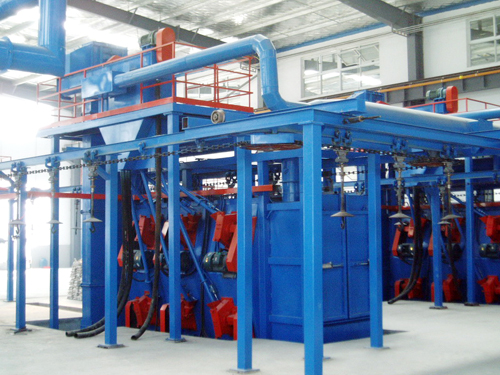 连续式是将工件悬挂在吊链钩上,匀速连续循环地通过抛丸室,进入清理室后,在自转机构的驱动下工件一边自转,一边前进,一边接受清理的工作方式。