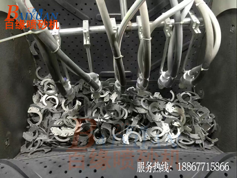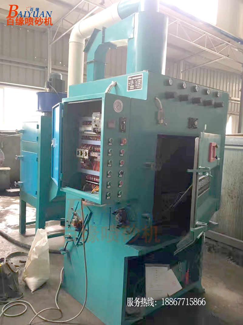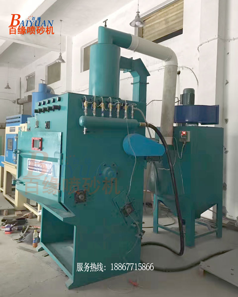 的工作原理:履带转动带动工件翻转,6把喷枪自动摇摆喷砂,喷砂均匀,无死角,全程自动处理,工人只需要取放工件即可