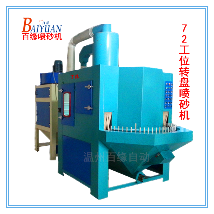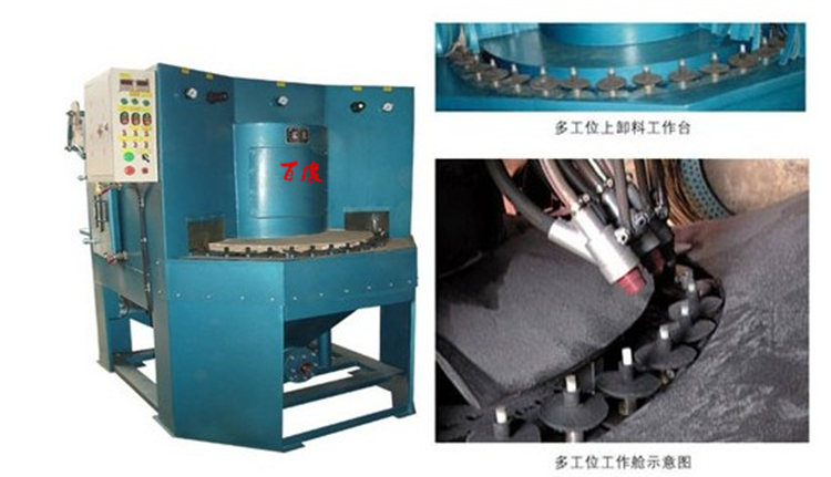 本机设计72工位摆放工件,实现全自动化单人喷砂作业,智能化微电脑[PLC]控制,真正做到安全生产。小转盘单独由一个电机带动,转速由变频器作无级调速,喷枪组采用固定结构,可调节喷射距离、角度以达到最佳喷砂效果。本机尤其适用于空心圆柱体类工件如手电筒等喷砂处理。本款机型工位数量可根据客户要求设计。