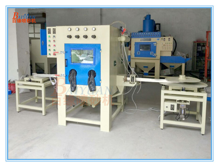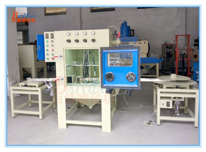 配套转盘工作台,工件自动输送、自动喷砂、自动回收。喷枪架位置可根据工件大小形状、高低左右方向调整,操作方便。