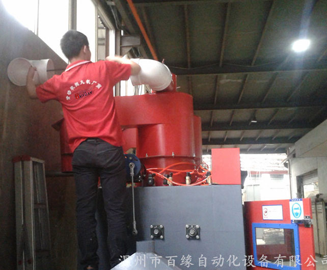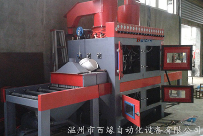 温州百缘新型双面自动喷砂机,本机设计新颖,结构可靠,操作方便,加工效率高,能源消耗低。本机适用于针对贵公司产品的喷砂加工要求,设计的专用喷砂设备,消除外表的污垢,划痕及其他杂物,使表面达到哑光状态,同样可以用于其他的锻铸件、焊接件、热处理件、冲压歼击机加工件、电子件的外表除锈、去氧化皮表面光亮及获得均匀的喷砂面和增加表面附着力或用于喷涂、电镀、油漆前的预处理的工序,既环保,无污染。本机采用全自动化多人喷砂作业,