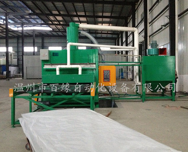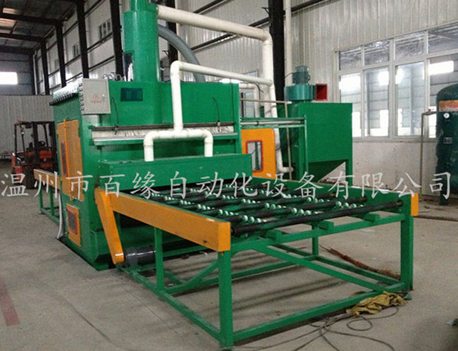 温州百缘新型双面自动喷砂机BY-2118-12A,本机设计新颖,结构可靠,操作方便,加工效率高,能源消耗低。本机适用于针对贵公司产品的喷砂加工要求,设计的专用喷砂设备,消除外表的污垢,划痕及其他杂物,使表面达到哑光状态,同样可以用于其他的锻铸件、焊接件、热处理件、冲压歼击机加工件、电子件的外表除锈、去氧化皮表面光亮及获得均匀的喷砂面和增加表面附着力或用于喷涂、电镀、油漆前的预处理的工序,既环保,无污染。