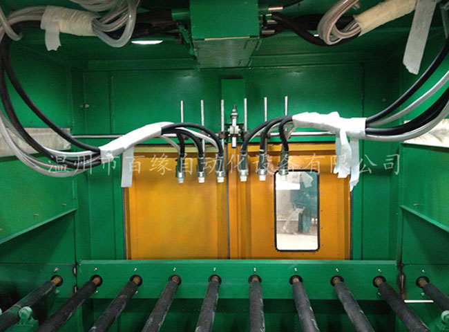 本机采用全自动化多人喷砂作业,本机设计12支枪,每6支枪分一组。喷枪平行移动,速度、出砂量、喷沙宽度。